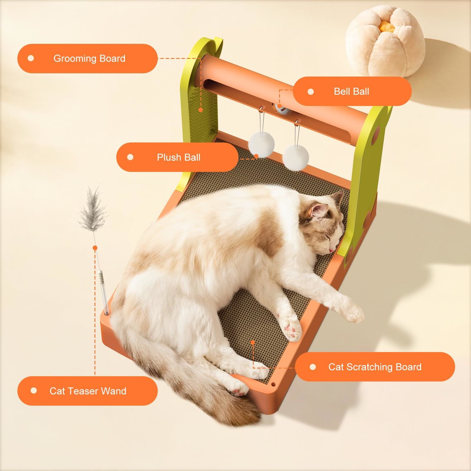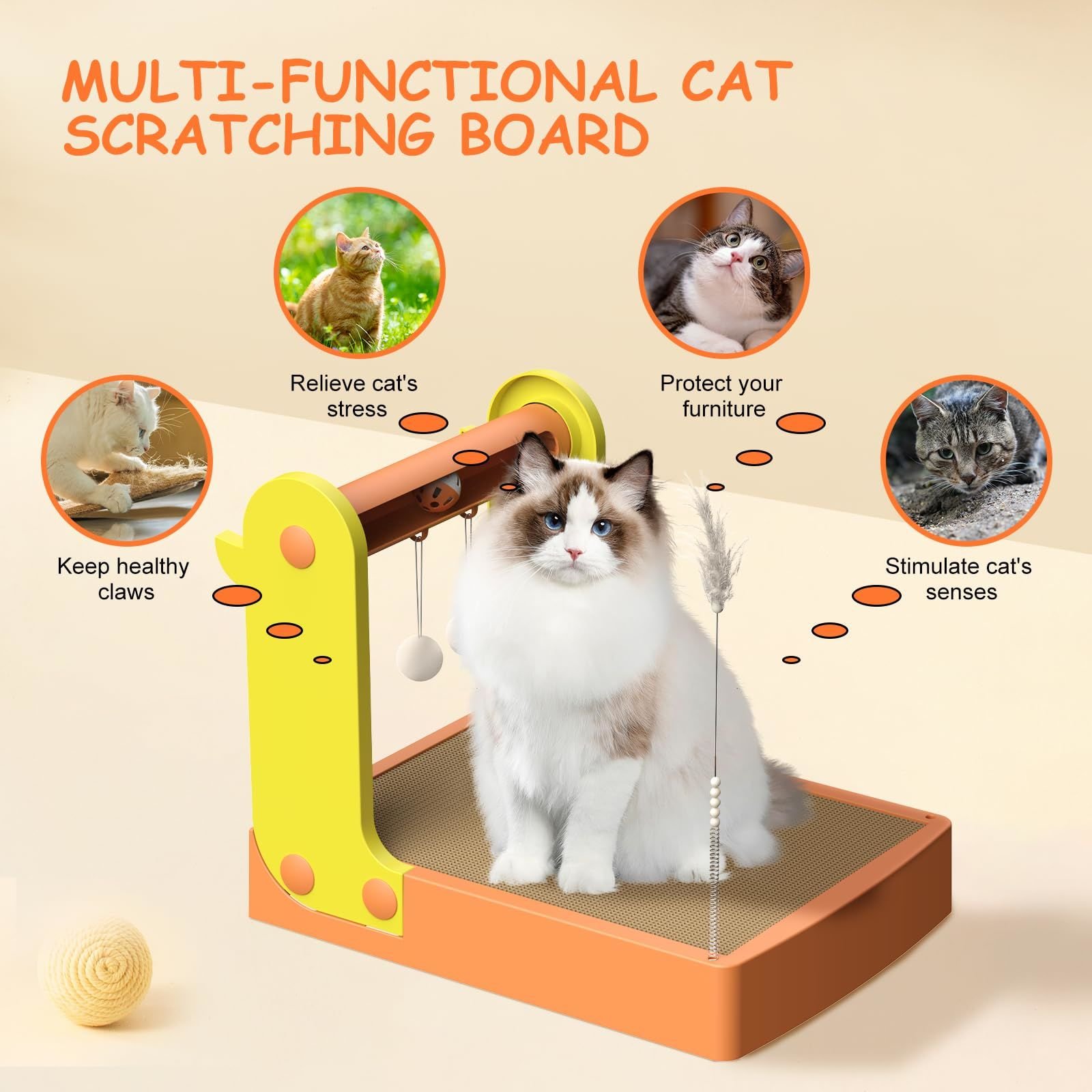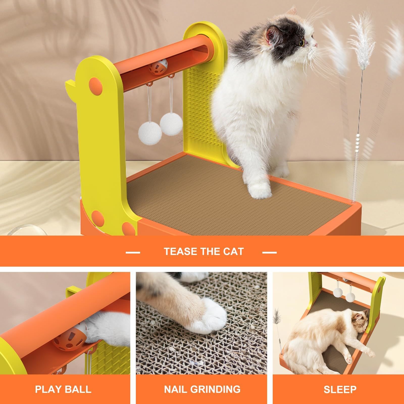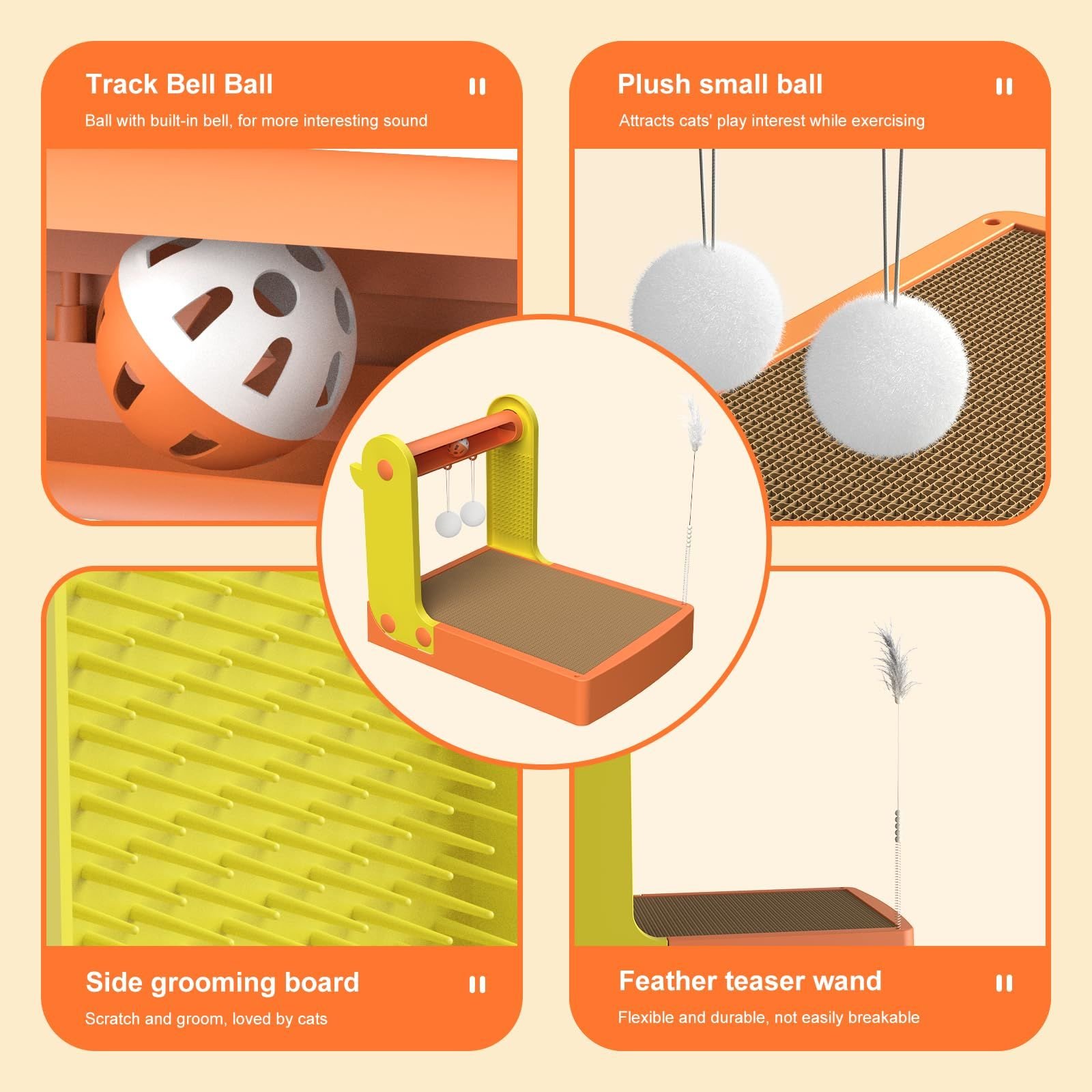 [5-in-1 CAT SCRATCHER SET] - This cat scratching board toy is a combination of a cat scratching board, a track bell ball, a plush ball, a combing board and a feather teasing stick. It meets the cat's needs for scratching and playing.
