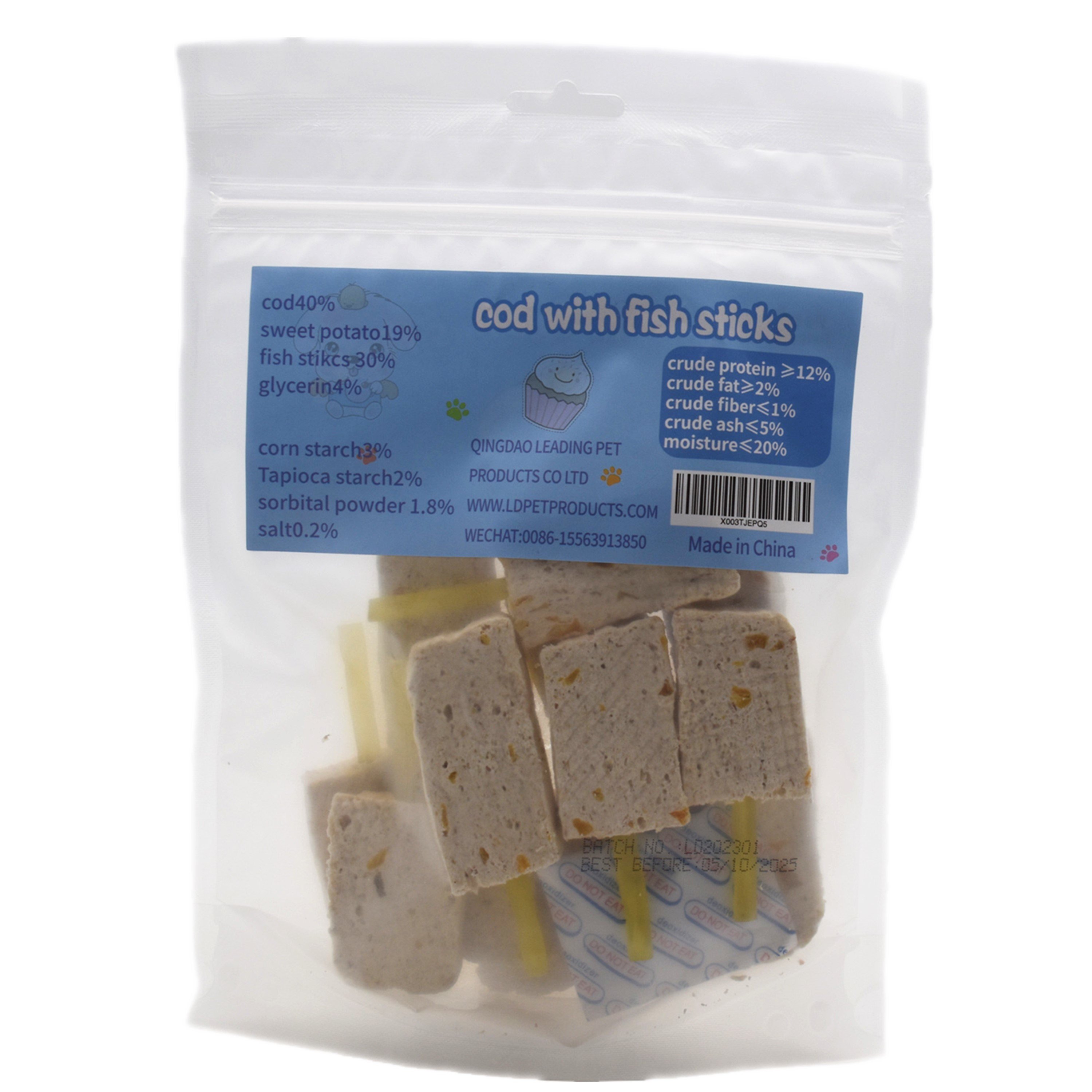 Pet snack is very popular among dogs. Dog treats can be used as a training prop for dogs, but also can enhance the bond between dogs and owners. Pet treat is a very good food.Composition: cod40% sweet potato19% fish stikcs 30% glycerin4% corn starch3% Tapioca starch2% sorbital powder 1.8% salt0.2%.