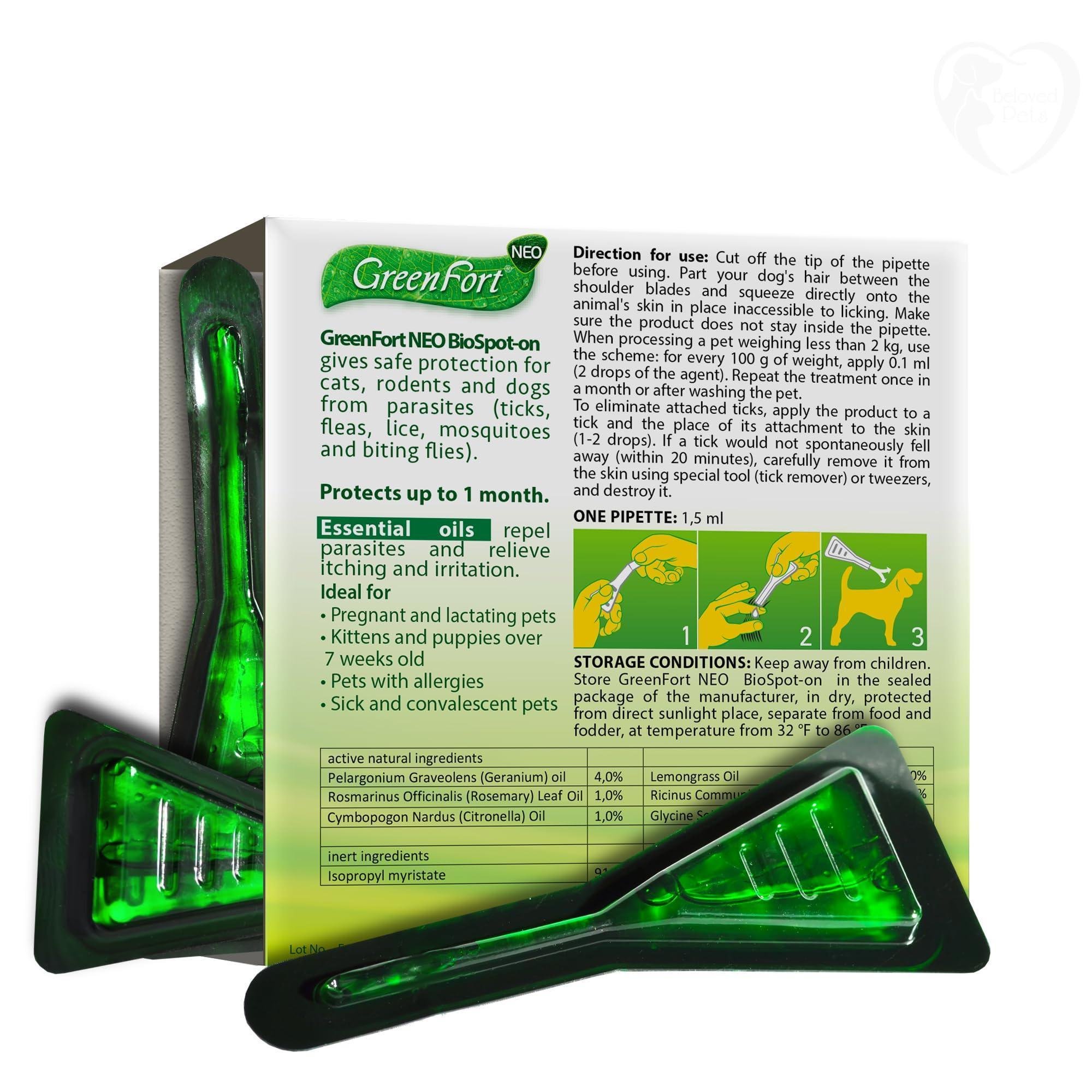 2.ABSOLUTELY SAFE AND EFFECTIVE PROTECTION (made of natural ingredients). This dog and cat flea treatment made with natural essential oils and does not cause harm your pet. 100% NATURAL AND ORGANIC. GreenFort NEO Bio Spot-On is ideal and safe for pregnant pets, kittens and puppies over 7 weeks old, pets with allergies and sick pets. The flea control you can trust.