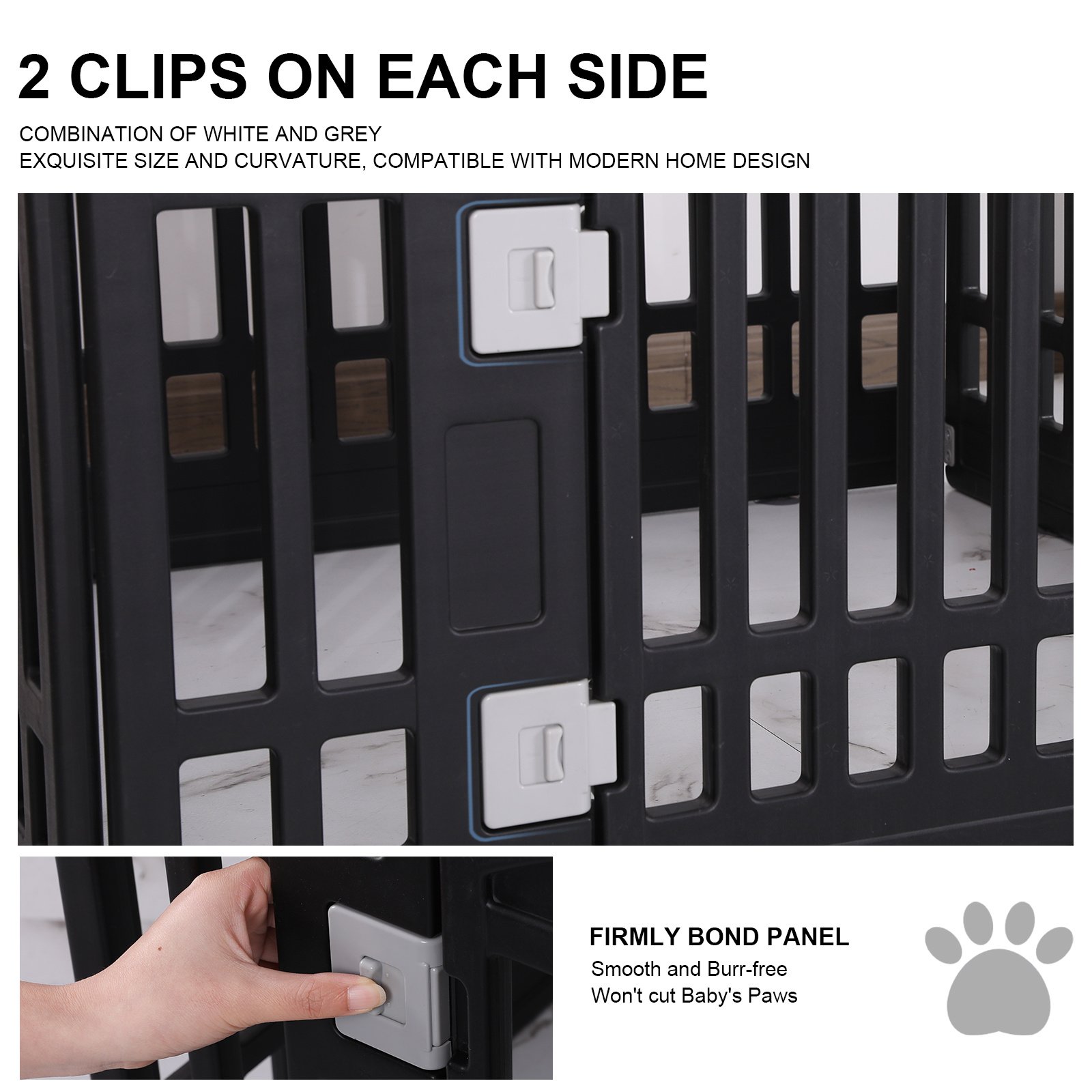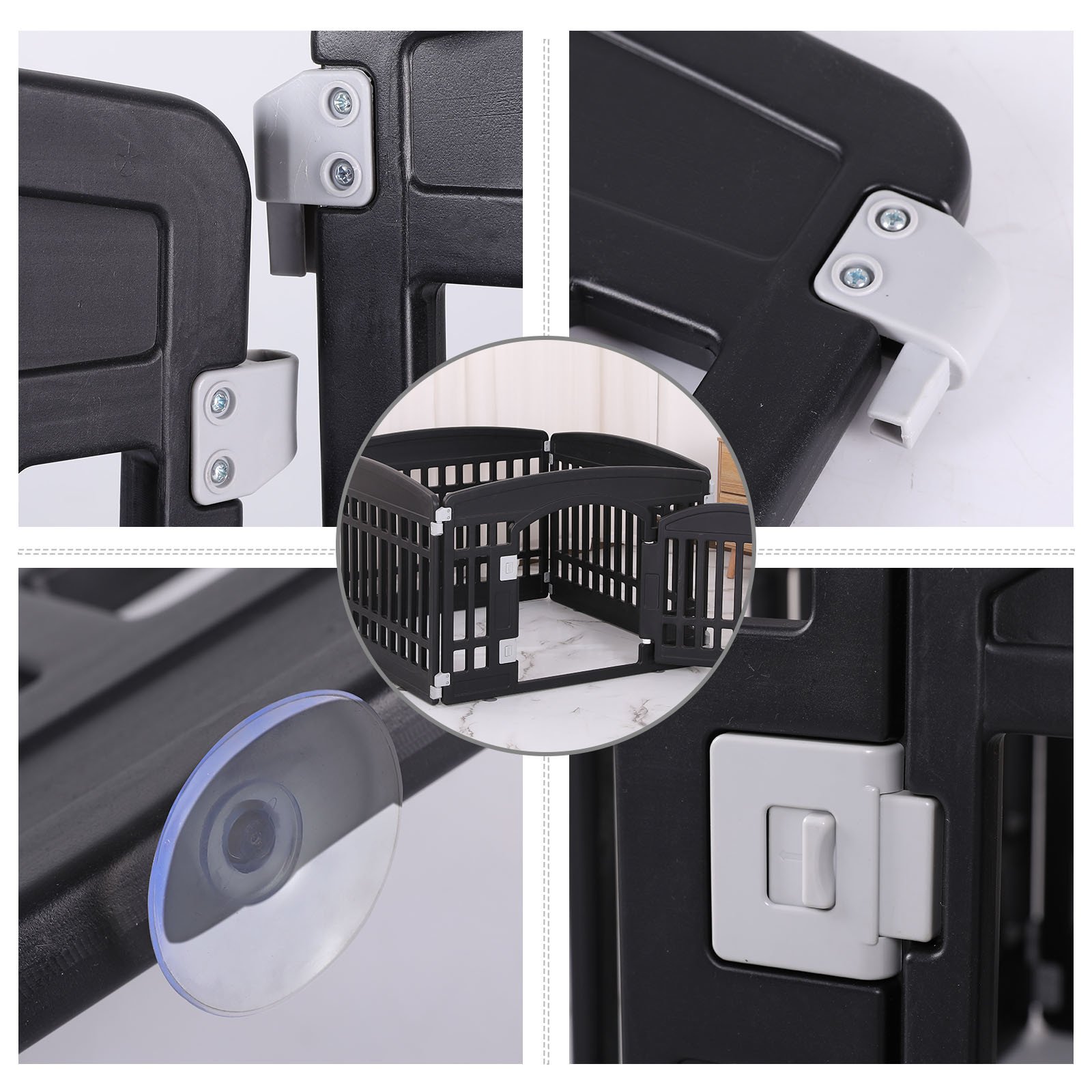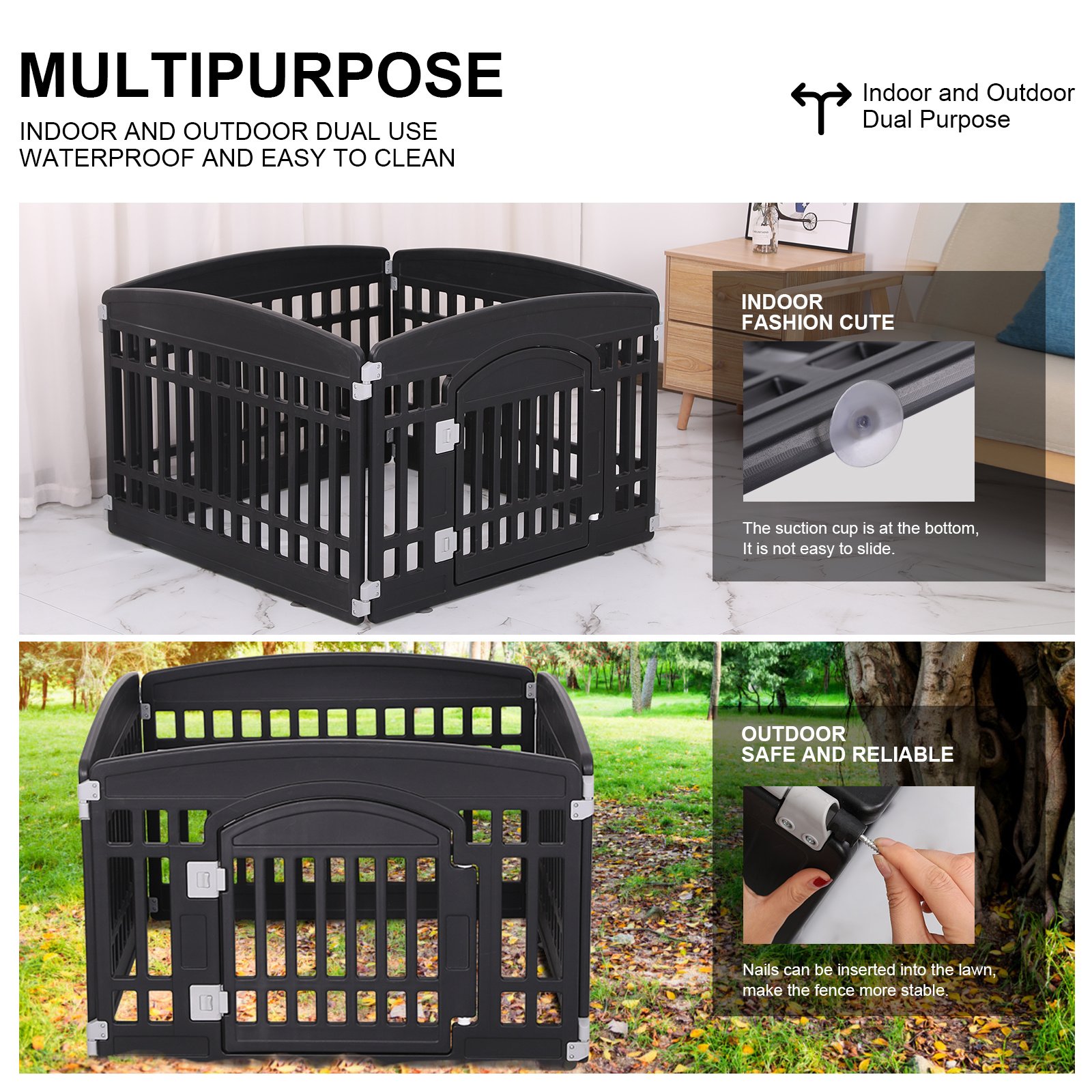 SECURE AREA: Give your pet an entertainment space that belongs to it.Pet playpen tall enough for a small pet to reach into the enclosure; puppy playpen keeps your pets safe from others.Our pet fence is made of safe; high-quality plastic; and is artificially trimmed; smooth and burr-free; so You don’t have to worry about your pet getting hurt.EASY TO INSTALL: Our dog fence comes with 4 panels and pet playpen constructed with simple assembly instructions will set up in minutes. You can quickly place the pet fence where you want.DIMENSIONS:3 ordinary door panels 33.5" W * 24" H; 1 panel with door 33.5" W * 24" H. The assembled size is 33.5(L)x33.5(W)x24(H). Suitable for small and medium-sized pets. Suggestion: The weight of pets should not exceed 44LB.INDOOR AND OUTDOOR: The bottom is equipped with a suction cup; which is not easy to slide. It is better when placed on smooth floors and tiles. In addition; it is equipped with 4 screws; which can fix the fence when it is used on outdoor grass.