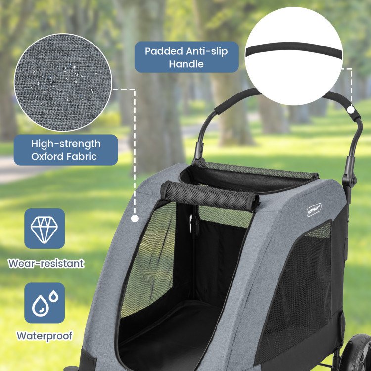 3.Effortless Maneuverability: Thanks to the 360° rotatable front wheels, you can effortlessly maneuver the pet stroller through tight and crowded areas. The brake pedal on the rear wheel allows you to stop the stroller steadily. For further convenience, the padded handle can be adjusted to improve posture and reduce fatigue.