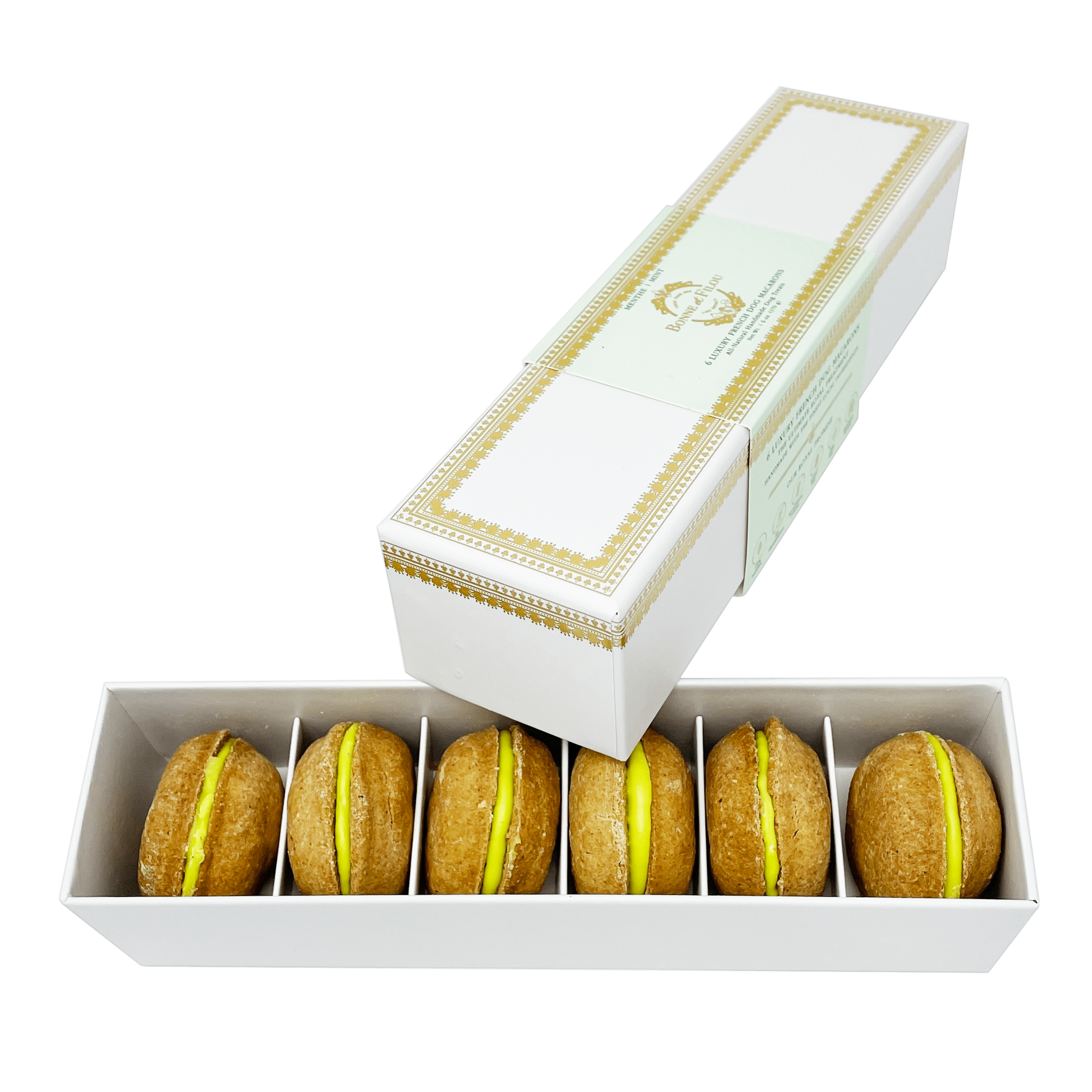 Dog Macarons - Count of 6 (Dog Treats | Dog Gifts)This box of our premium macaron treats features: - Box of 6 dog macarons- Handmade with premium human-grade ingredients in the USA- 100% natural; corn-free; wheat-free ingredients- No artificial coloring or preservatives- Hard treat designed for a long-lasting chew- Shelf life of 12+ months | No need for refrigerationBase Recipe Ingredients: Oat Flour; Honey; Coconut Oil; All-Natural Flavored Yogurt FillingFeeding Instructions:Our treats are hard; designed for a long-lasting chew. For elderly or small dogs; we recommend breaking the treat in smaller pieces (by twisting both sides).