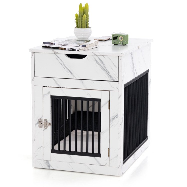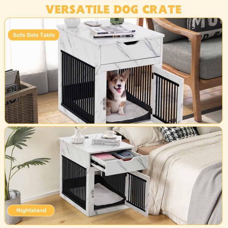2.Large Additional Storage: The 20" x 25.5" (L x W) tabletop of dog kennel withstands a weight of 100 lbs to hold various items, like lamps, photos, cups, etc. Plus, it has a 15.5" x 15.5" x 3" (L x W x H) drawer, allowing storage of dog toys, food or snacks.