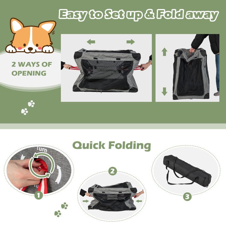 1.2 Setup Ways and Instant Folding: No tools needed, the soft kennel has 2 red straps on both sides. Just pull them outwards at the same time, the frame will easily expand. Or you can grab a strap and lift the whole crate upwards, it will be instantly set up as well. After use, rotate its side knob, then it will quickly get folded in a small size.