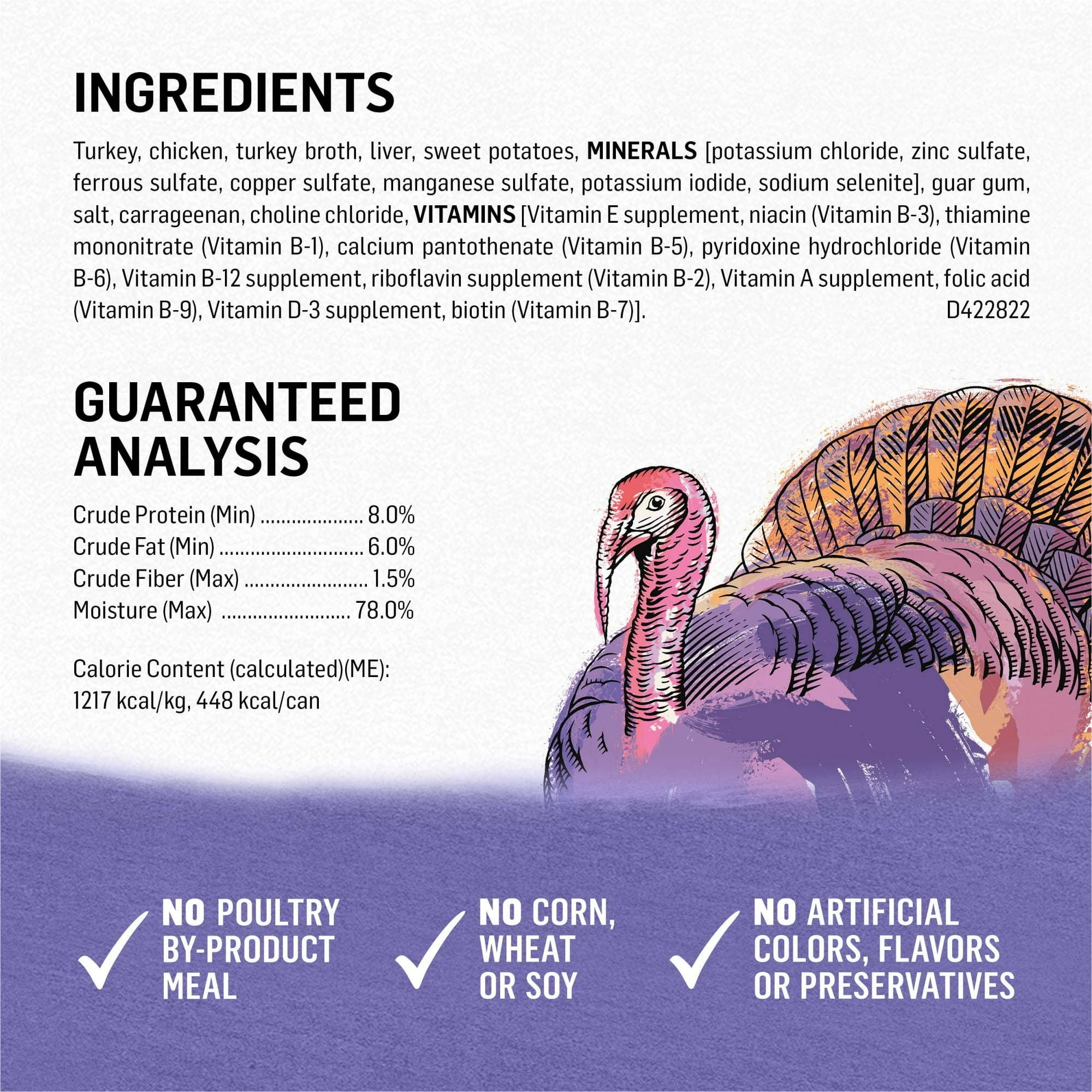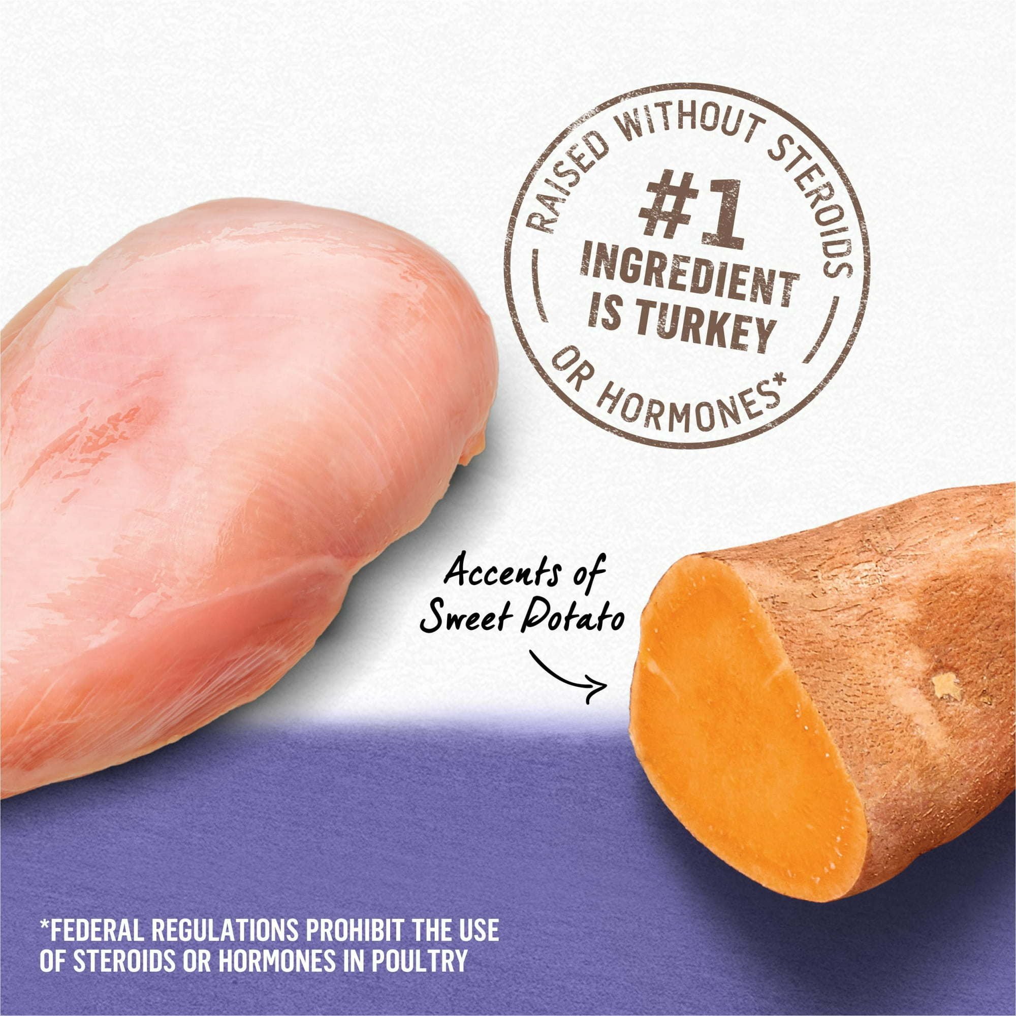 Real turkey raised without steroids or hormones is the #1 ingredient in our grain free dog food with sweet potato (Federal regulations prohibit the use of steroids or hormones in poultry)